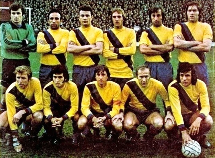 La formación del Barça a fines de los 70, con Cruyff (capitán, tercero abajo de izquierda a derecha) y Heredia (con la pelota, abajo a la derecha). Foto @Elwood_White