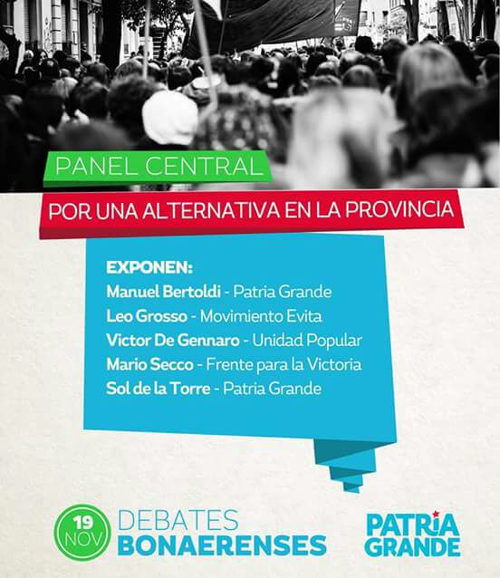 El sábado 19 de Noviembre en la Universidad Nacional de Quilmes la organización Patria Grande va a realizar “DEBATES BONAERENSES” Claves para construir una alternativa política en la provincia