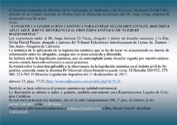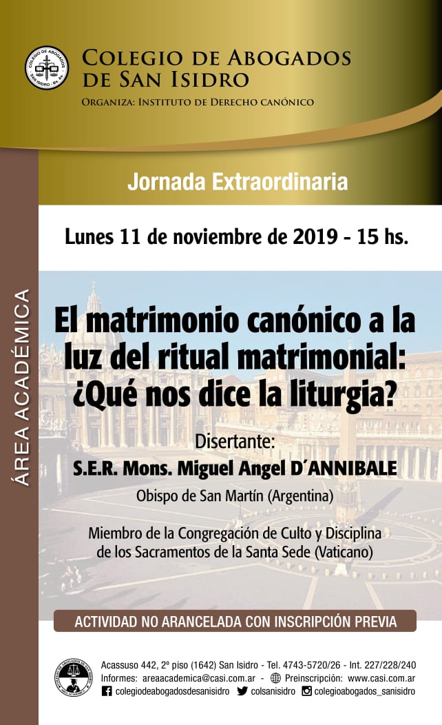 La Sociedad Argentina de Derecho Canónico convoca a la Jornada Extraordinaria que se desarrollará el día 11 de noviembre de 2019 a las 15 hs. Disertante S.E.R. Mons. Miguel Angel D`Annibale, Obispo de San Martín, Bs. As. y el dia 29 de noviembre de 2019 a las 15 hs en la sede del Colegio de Abogados de San Isidro, en la cual disertará el socio plenario Dr. Miguel M.F. Repetto Rolon, conjuntamente con las Dras Maria del Rosario De La Fuente y Sofia Maria Parra Senfet quienes abordarán el tema "Derecho Concordatario. Concordato Argentino 1966", "La sujetividad Internacional de la Santa Sede", “Acuerdos de la Santa Sede con el Estado Argentino“, respectivamente.