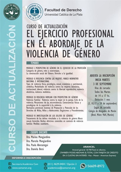 La Facultad de Derecho de la Universidad Católica de La Plata y el Colegio de Abogados de Morón invitan al curso de actualización profesional: “El ejercicio profesional en el abordaje de la violencia de género”, que se realizará en el mes de Septiembre. Más info en ésta nota.