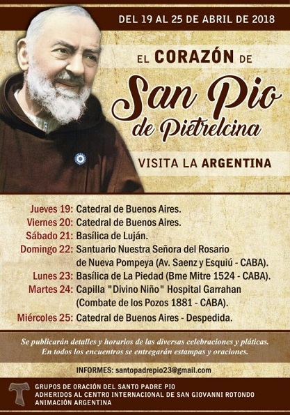 Buenos Aires (AICA): Con el lema “Padre Pío: Ecos de un corazón santo”, el corazón de San Pío de Pietrelcina llegará a la Argentina y recorrerá, entre el 19 y el 25 de abril, diferentes lugares donde será expuesto para su veneración.